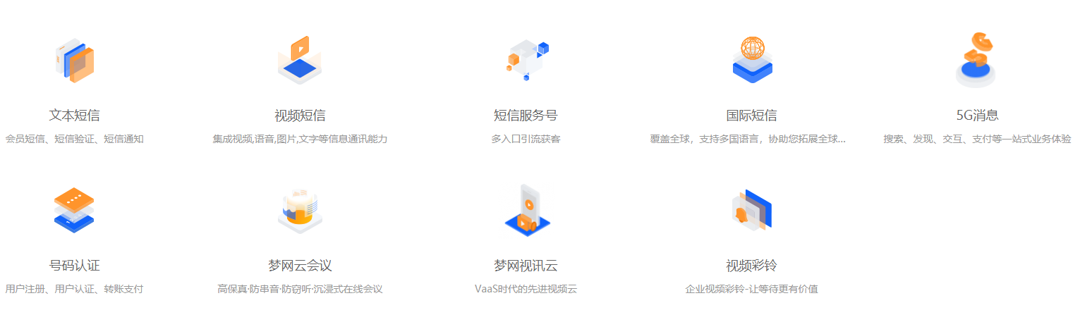 除文本短信外,evo真人视讯科技已开发并良好运营着包括视频短信、短信服务号、国际短信、5G消息、号码认证、evo真人视讯视讯云等多种云通信产品。